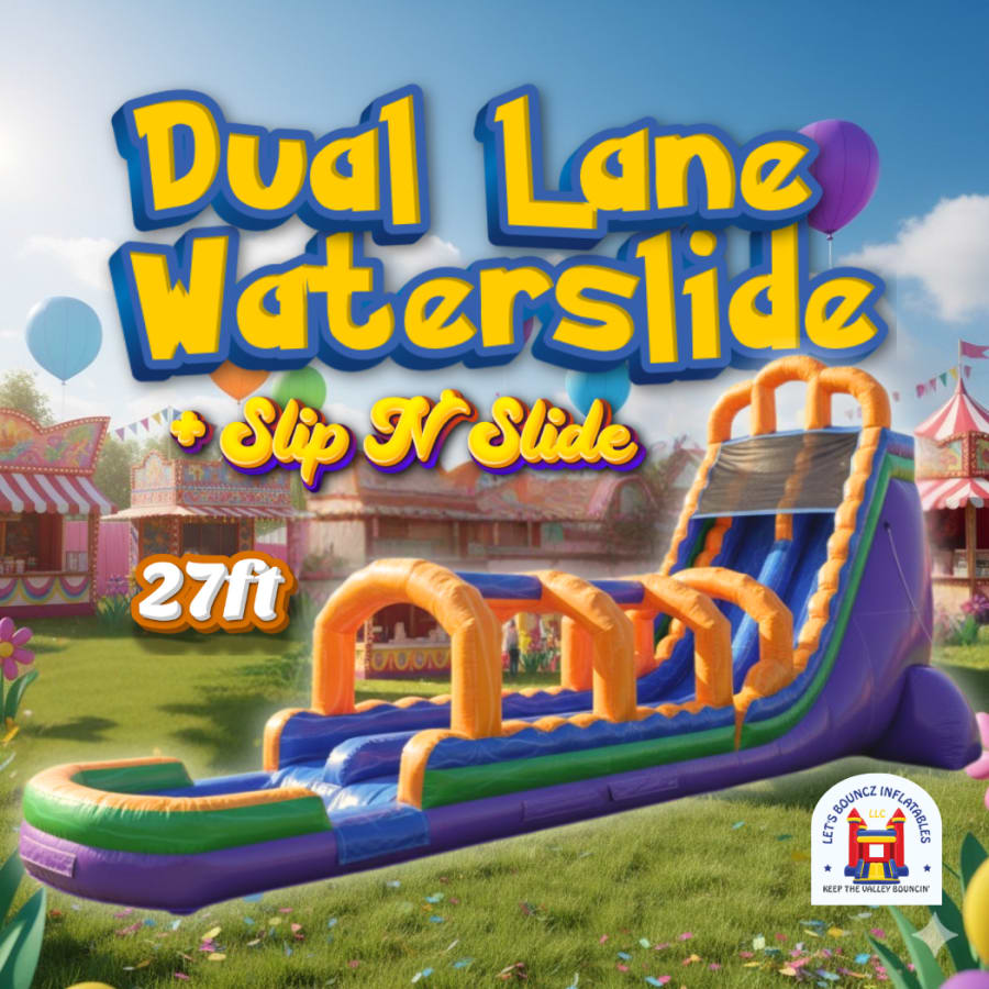 Introducing the ultimate aquatic thrill ride that will make your heart race and your summer unforgettable: the brand-new 27-foot Dual Lane Waterslide with Slip and Slide! Get ready for an adrenaline-pumping adventure that will have you screaming with delight from the moment you take the plunge! Prepare to be amazed, prepare to be soaked, and prepare to experience the summer of a lifetime. So, grab your swimsuit, summon your courage, and get ready to take the plunge like never before with this epic waterslide extravaganza! The countdown to summer excitement starts now!