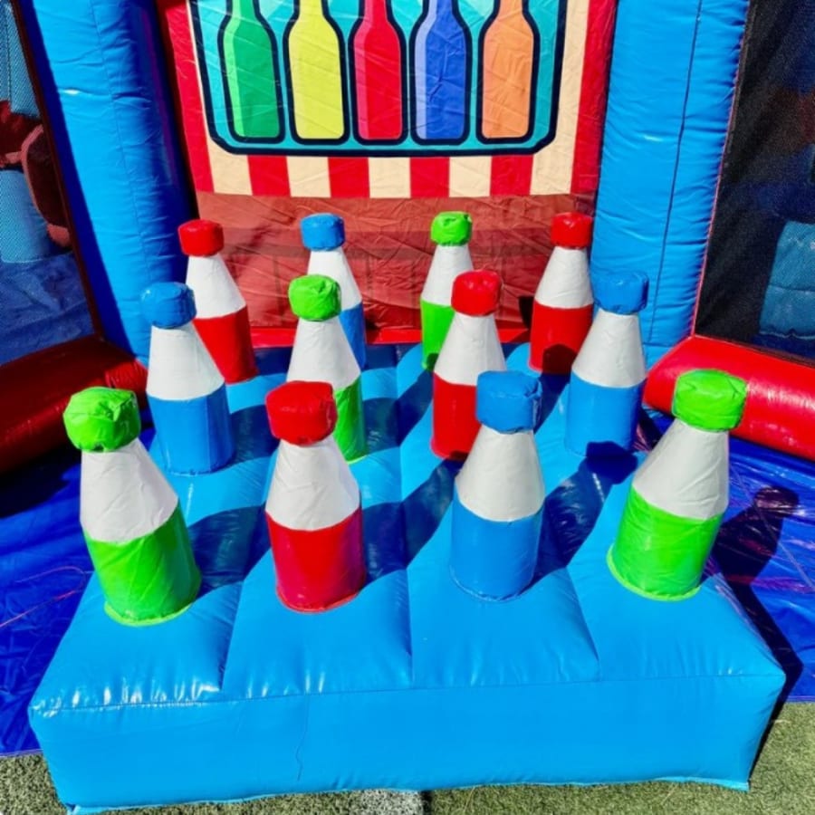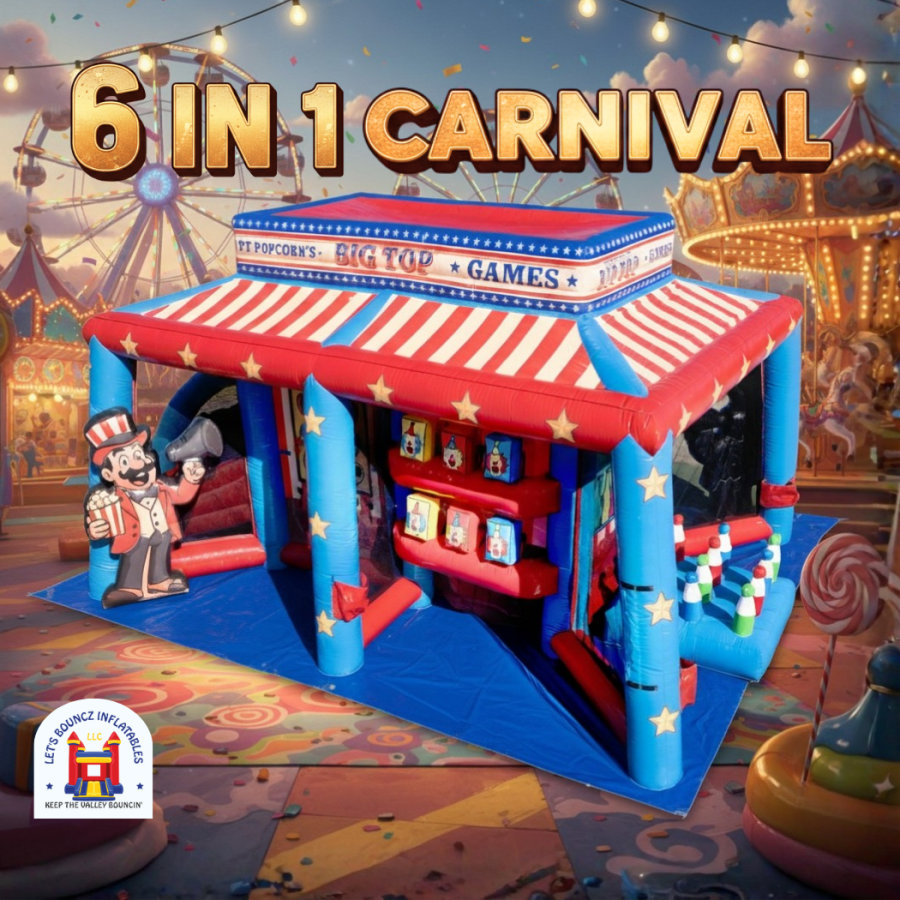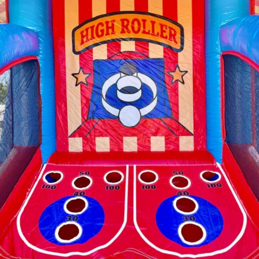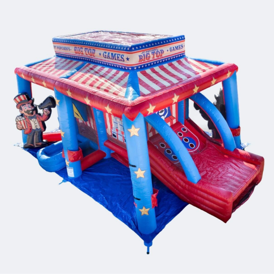 Get ready to bring nonstop carnival fun with the Big Top 6! This action-packed inflatable lets you play Bank a Ball, Milk Can Toss, Balloon Pop, Knock ‘Em Down, High Roller, and Ring Toss all in one exciting setup.