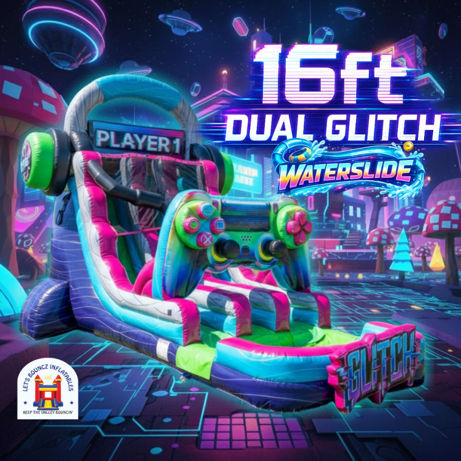 Get ready to dive into the digital world with our 16ft Dual Glitch Waterslide! Featuring a massive inflatable game controller and a "Player 1" headset topper, this slide is a dream come true for gaming fans. Race your friends down the dual lanes and end with a splash in the landing pool.
