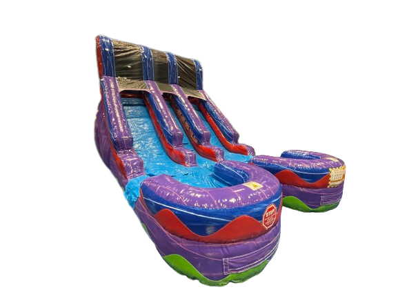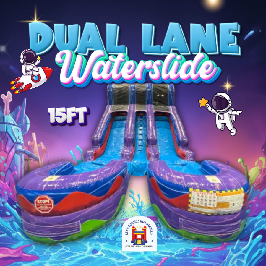 Get ready for double the fun with our exciting 15' Dual Lane Slide! Whether you're planning a backyard party, a corporate event, or a school carnival, this slide is perfect for all occasions. With its dual lane design, you can have two participants racing side by side, adding an extra element of competition and excitement. Inflated pool at the bottom of both slides.
