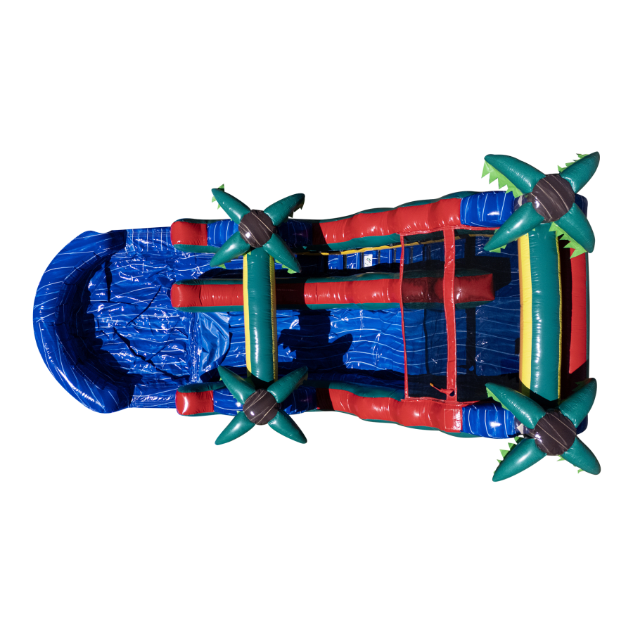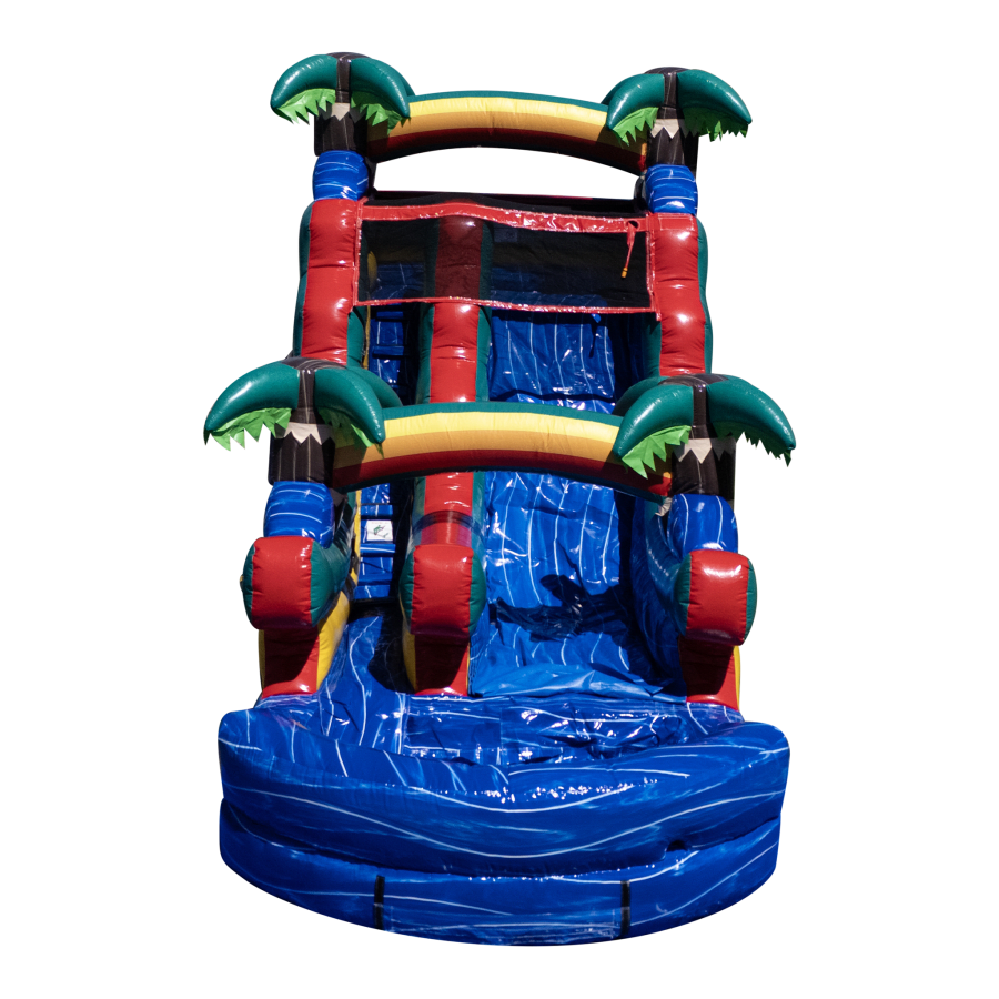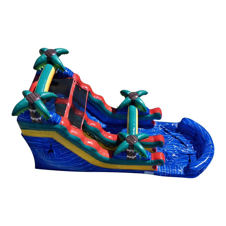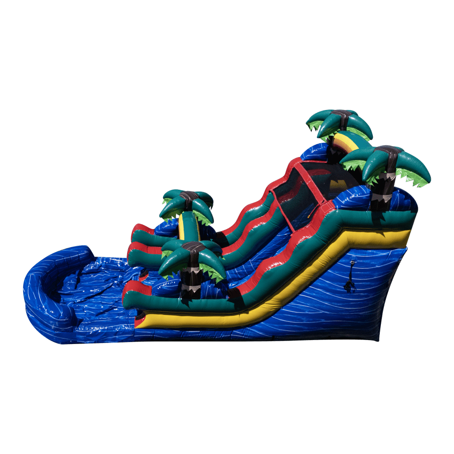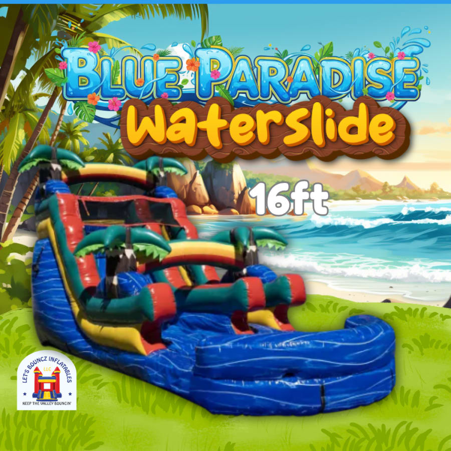 Bring the ultimate splash of fun to your event with our 16ft Blue Paradise Waterslide! Featuring a vibrant tropical theme and a built-in inflated pool at the bottom, this slide is perfect for kids and adults alike. Safe, clean, and eye-catching.