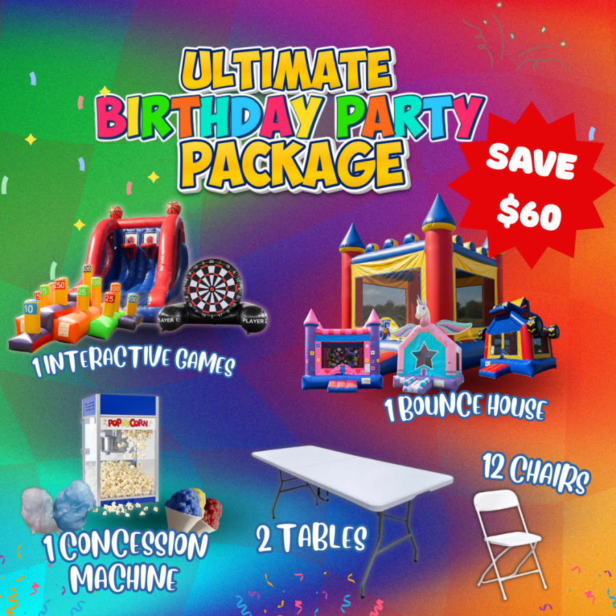 Celebrate your child’s birthday and SAVE $60 with our Ultimate Birthday (Bounce House) Party Package! Perfect for kids of all ages, this package brings fun, excitement, and endless memories in one convenient bundle.